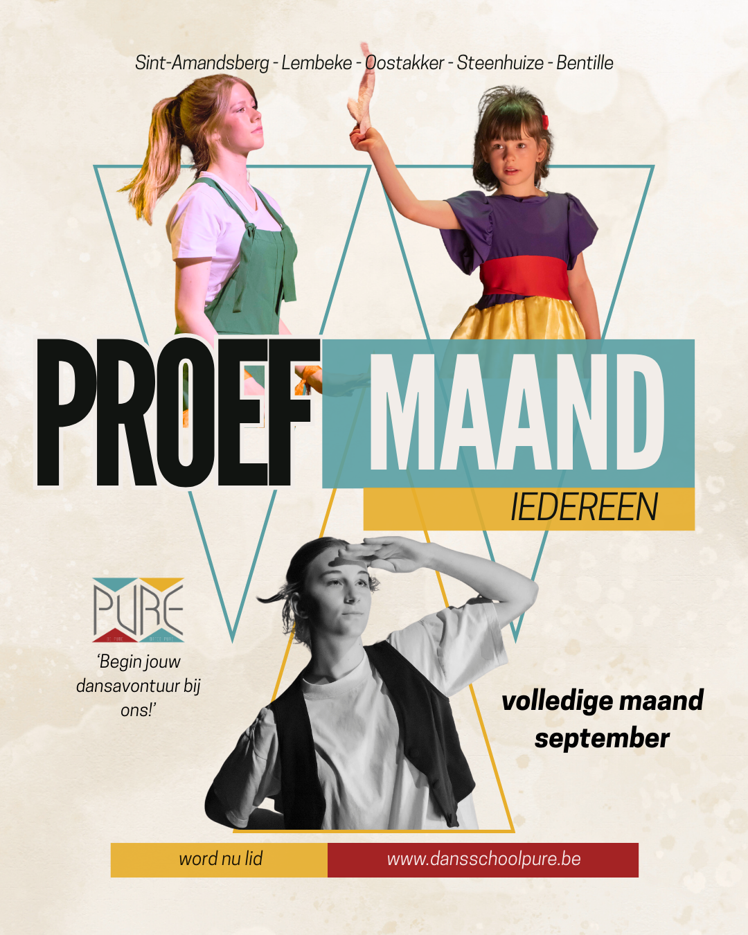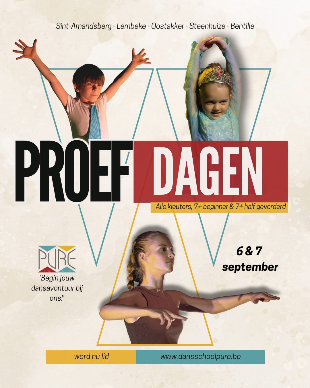 Dansschool PURE is een dynamische dansschool die garant staat voor kwaliteit en intense dansbeleving. Geleid door een team enthousiaste professionals en vrijwilligers brengen we de passie voor dansen over aan jong en oud. In elk van onze 3 afdelingen (Gent, Lembeke en Oostakker) zorgen onze docenten en vrijwilligers er dag in dag uit voor dat danstalent kan groeien in een ontspannen sfeer en met open blik. Voor iedereen die van dans wil proeven of er helemaal weg van is...